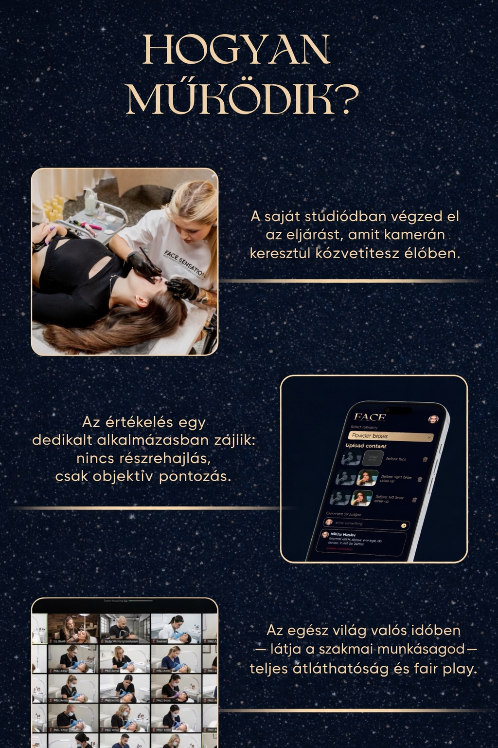 A részvétel számos szakmai előnnyel jár: erősítheted portfóliódat, új fotóanyagokat készíthetsz, szakmai elismerést szerezhetsz díjak és oklevelek formájában, valamint értékes kapcsolatokat építhetsz más sminktetoválókkal, oktatókkal és szalonokkal. A verseny hangulata egyszerre professzionális, inspiráló és támogató – olyan közeg, ahol bátran kérdezhetsz, tanulhatsz, és közben valódi sikerélményt szerezhetsz.